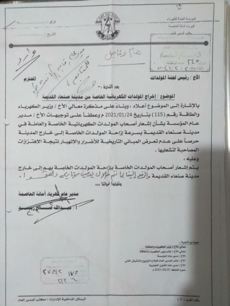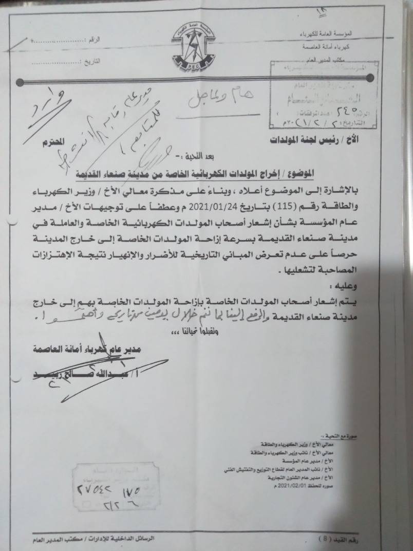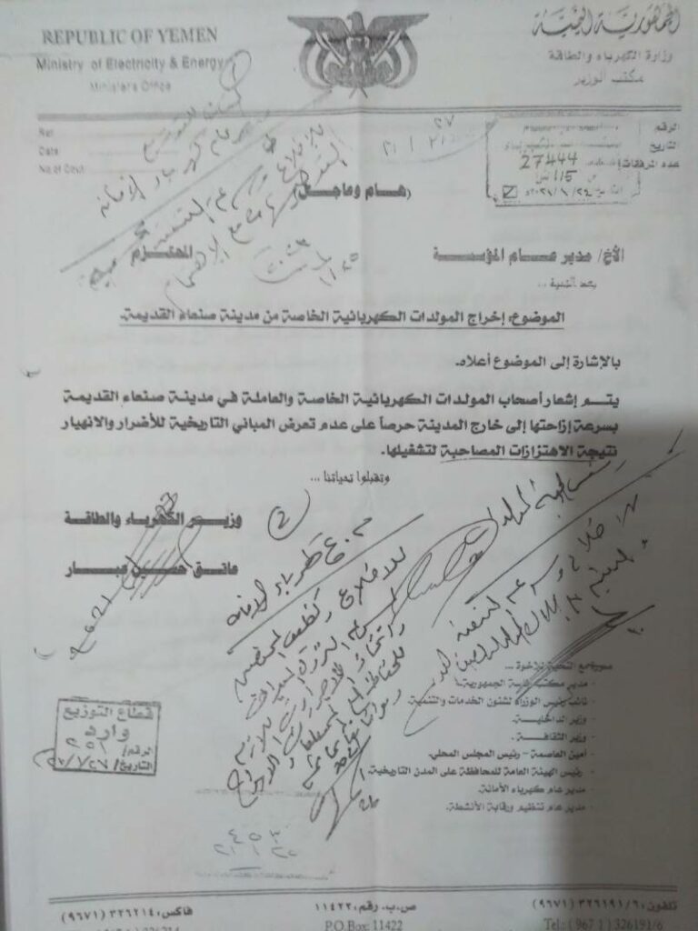كذلك وجهت وزارة الكهرباء عام 2021، وعلى مرتين، بإخطار أصحاب المولدات الخاصة العاملة داخل صنعاء القديمة بسرعة إزاحتها إلى خارج المدينة “حرصاً على عدم تعرض المباني التاريخية للأضرار والانهيار، نتيجة الاهتزازات المصاحبة لتشغيلها”.