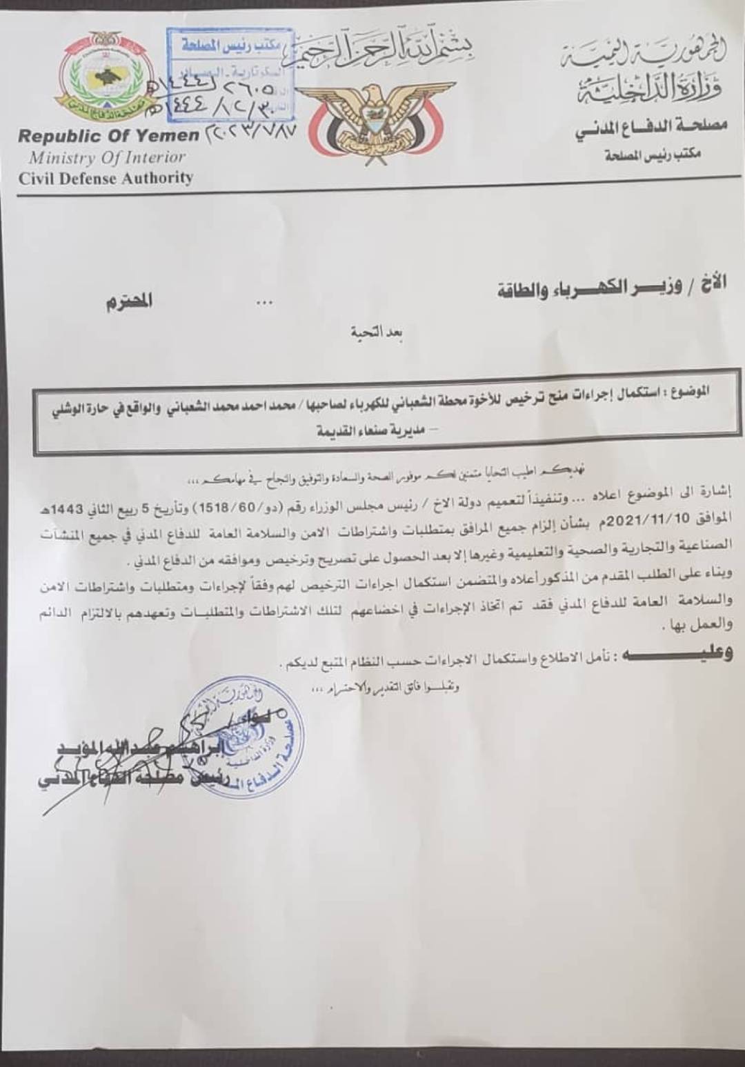 في المقابل، فإن مصلحة الدفاع المدني تُعنى بالمراقبة وإيقاف أي منشأة تخالف شروط السلامة العامة. لكنّ المحطات ما زالت تعمل، ولم تتمكن مصلحة الدفاع المدني من تطبيق القانون، وألقت بالمسؤولية على وزارة الكهرباء كونها الجهة المسؤولة عن منح التراخيص لمالكي المولدات داخل صنعاء القديمة، وفق مدير عام العلاقات العامة والإعلام خالد الشراحي.