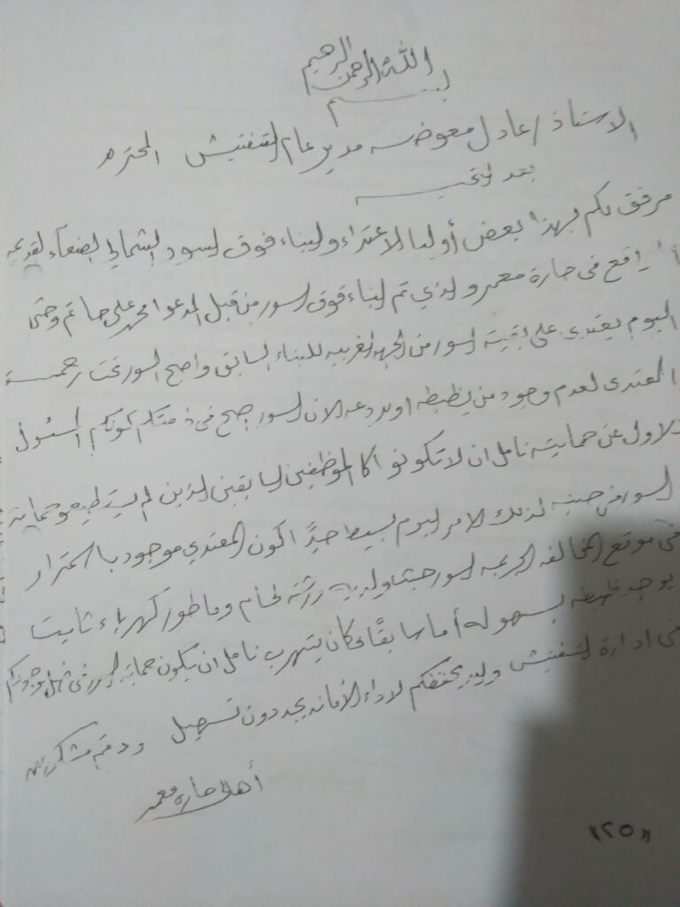 وعند التدقيق في الملف، وجدنا عرائض شكاوى مقدمة من الشرطة السياحية في 2019، إلى وزير الثقافة، ووكيل الوزارة لقطاع الآثار، ضد نائب رئيس الهيئة العامة للمحافظة على المدن والمعالم التاريخية في حينه، عقيل النصاري لمنعه تنفيذ أوامر الإزالة.
